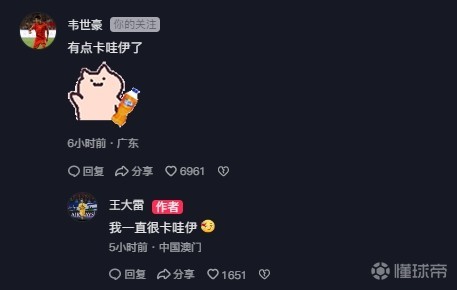 在这条动态的评论区,成都蓉城队队员韦世豪留言打趣道——“真是可爱极了。”随后,王大雷回应——“我一直都很可爱。”